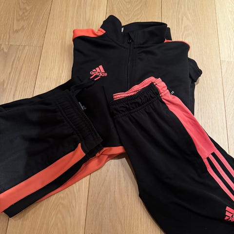 Kul jakke og bukse i treningsstoff fra Adidas Performance. Settet er i modell Messi, fotballspilleren. Ikke brukt, bare prøvd på en gang, men var litt for lite for brukeren her. Oppleves som smal, og litt liten i størrelsen. Vasket en gang med parfymefritt vaskemiddel. Lappene inni er klippet av.