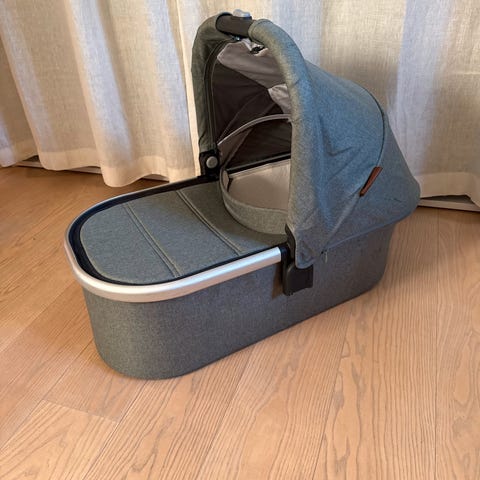 Tre større rom til flaske o.l., en lomme til mobil og en lomme med glidelås. Festes til vogn med borrelåshemper