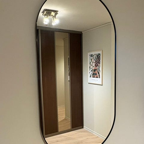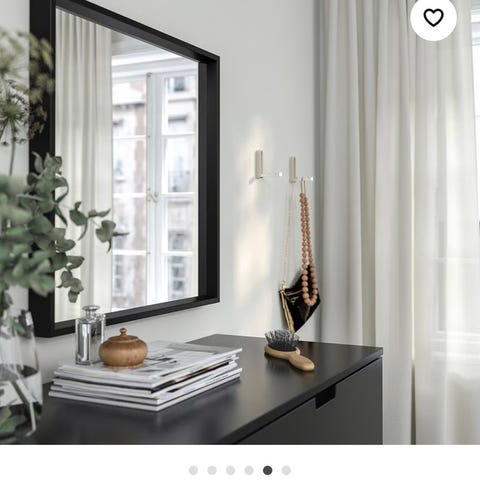 IKEA Hovet speil i hvit farge. Speilet har et enkelt og moderne design som kan brukes i ulike rom som soverom eller gang. Passer for oppheng på vegg.