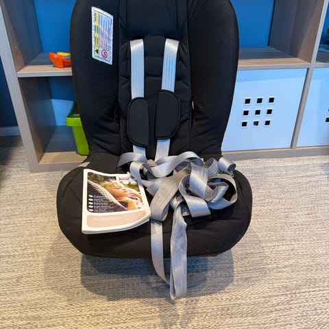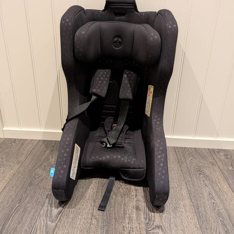 Sete stått hos besteforeldre som er kun brukt at par ganger. Selges med nyfødt innlegg. Sete kan vendes slik at det er enkelt å få barnet ut og inn av bilen.