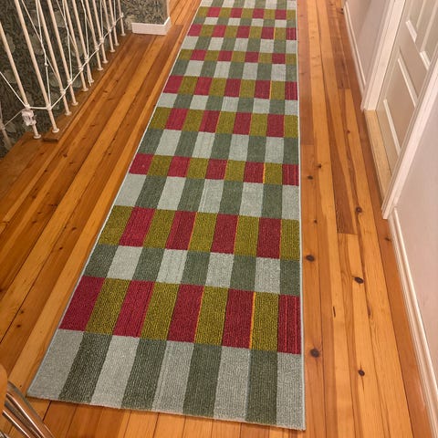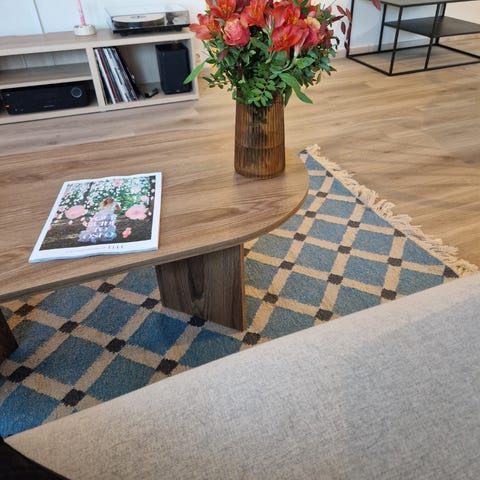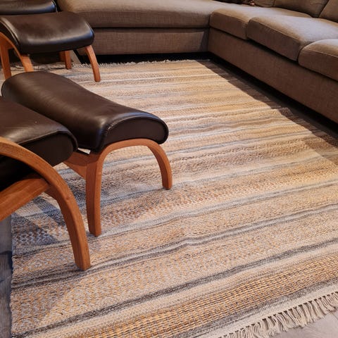 Teppet har en liten skade i det ene hjørnet som visst på bilde. Ellers er teppe i god stand og uten flekker.