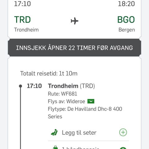 Fly fra Bergen til Trondheim 28. Desember kl 21:45