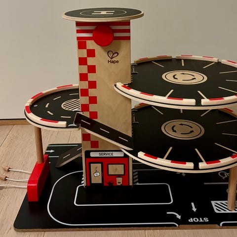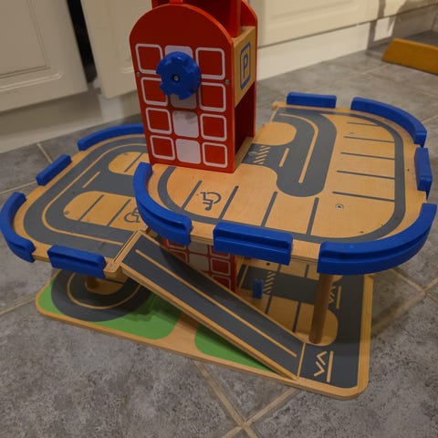 Parkeringshus/ bilbane laget av tre. Flere nivåer og ramper for lek med små biler.