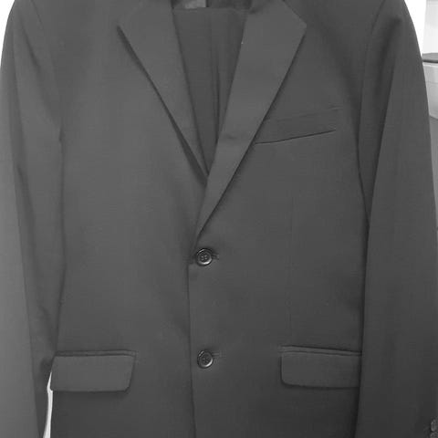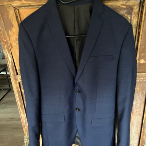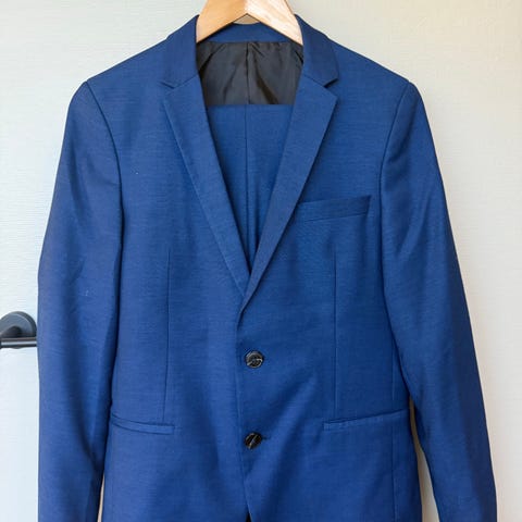 Mørkeblå dress til ungdom .Smal passform, veldig stilig og svært pent brukt, ingen bruksmerker . Lysblå skjorte.