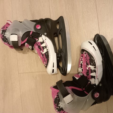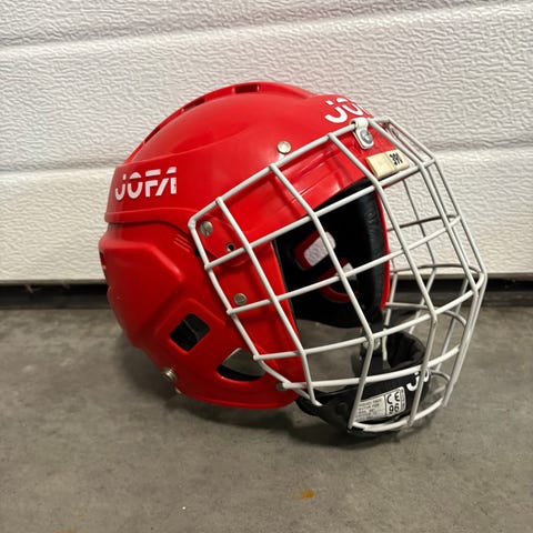 Jofa ishockeyhjelm i rød og blå farge. Hjelmen er designet for bruk i ishockey og gir beskyttelse under sporten.