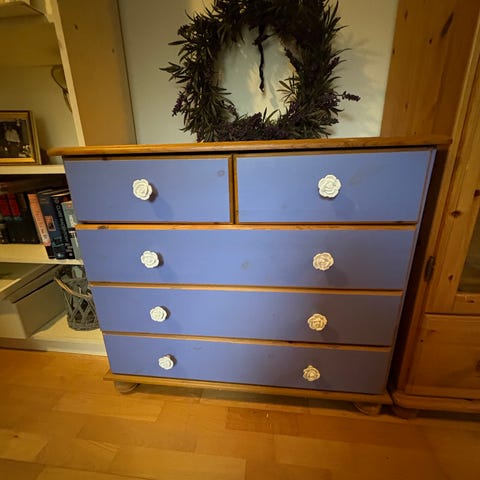 Liten kommode med trådskuffer og oppbevaring, brukt som møbel i entré. Speil og kommode er i samme stil, kan selges separat eller samlet til 500kr.
