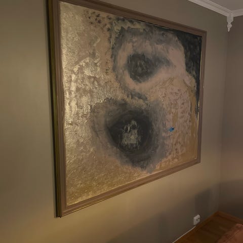 Maleri med motiv av et tre med fargede sirkler på grenene og en tekst under treet. Teksten er på norsk og sier: "Hvis vi blir helt stille nå, kan vi høre hjertet slå.