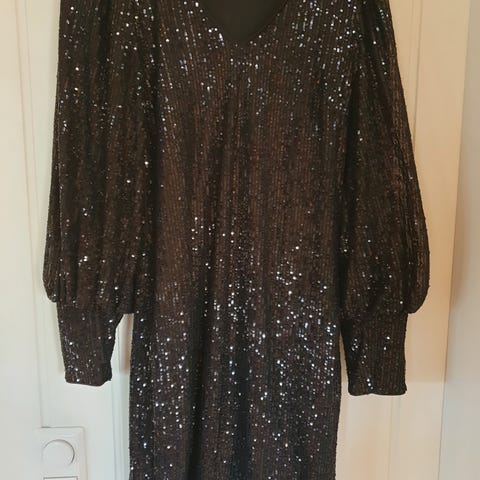 🖤 Svart kjole med blondestoff, lange ermer, v-ringet i halsen, halvlang, Floyd i str M selges kr 200,-