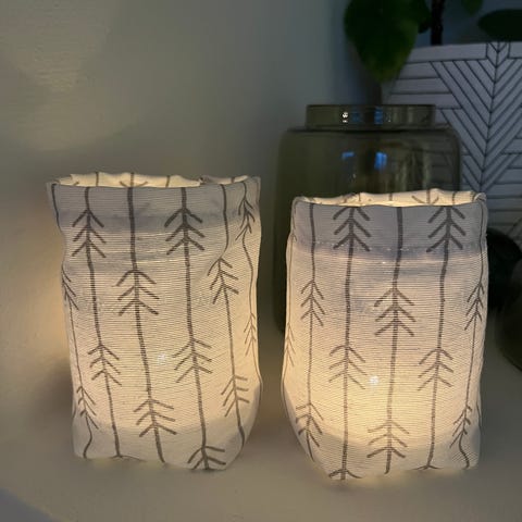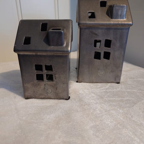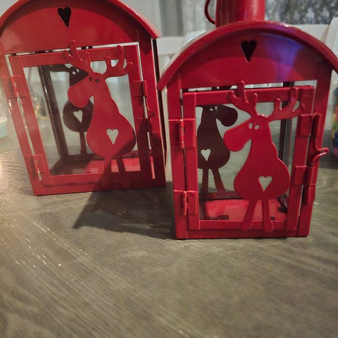 2 stk lykter/lysholdere med motiv av kongler. Svarte, med kant og motiv i rosegull. De måler 8,8 x 10 cm. Aldri brukt