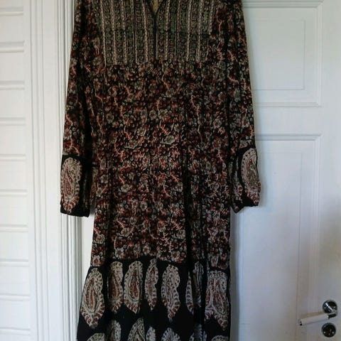 Vakker og unik maxikjole i 100% bomull. Minner om Desigual. Nydelig materiale, rike farger og mønster. Str. XL men passer M/L. Lite og pent brukt, ingen bruksmerker. Hentes i Lørenskog eller sendes.