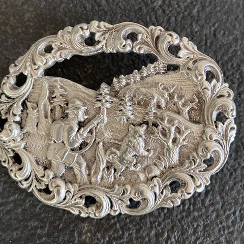 Brosje i sølv til salgs. Se bilder for stempler. Er hel og fin. Kan sendes. Selges til 500 kr.
