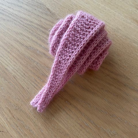 Sophie Scarf strikket i oppskrift fra petiteknit (men litt smalere) og lengde er ca 110cm. Strikket med to tråder i baby merinoull og silk mohair