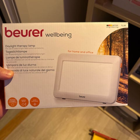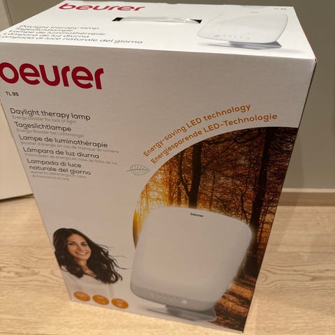 Beurer Lampe for lysterapi med hvit farge, designet for å gi dagslyslysbehandling. Produktet er egnet for bruk i hjemmet for å forbedre velvære ved å simulere naturlig dagslys.
