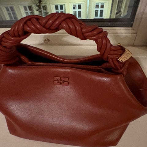 Selger en helt ny skinnveske fra Ganni i svart. Den største modellen. Den har en flettet bærereim og avtagbar skulderreim som er justerbar. Vesken har et innvendig rom og en liten kortlomme på innsiden.