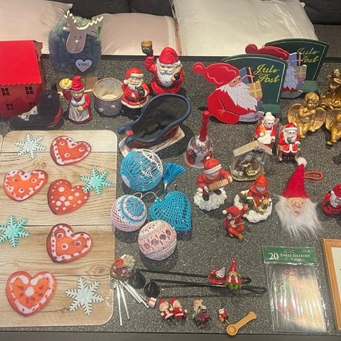 Julepynt dekorasjon med flere elementer i ulike materialer og farger. Passer til innendørs bruk som borddekorasjon i julen.Hbo 150 .Kan hentes på Frakkagjerd eller sendes mot portp