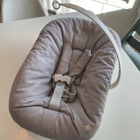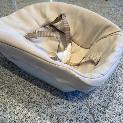 Nyfødtsete som kan festes til til Stokke tripptrappstol. Setet er grått og pent brukt. Trekket er nyvasket.