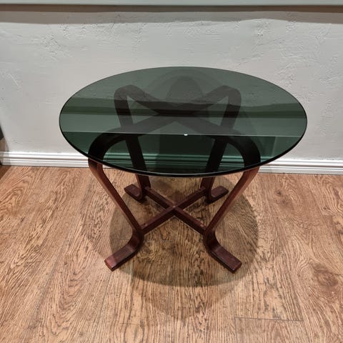 Svært dekorativt shabby chic sofabord i solid metall med slepet glassplate..