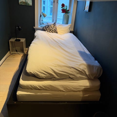 Seng med 2 skuffer. Brukt på gjesterommet. Kan justere sengen til enkelt- eller dobbeltseng eller som dagseng! Den kommer med to store skuffene som er veldig praktiske. Rammen ble malt grønn, deretter til hvit. Noen små områder viser fortsatt grønn maling som du kan male over. Et par skruer mangler og har blitt byttet ut med nye skruer, og det er boret noen ekstra hull for å støtte den. Den holder fortsatt stand og fungerer fint. Vi ga bort madrassen så har kun sengerammen til salgs. Den er demontert og klar for henting.