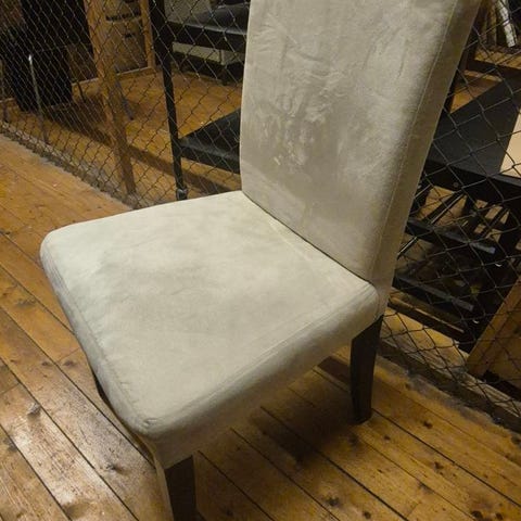 Spisestol med grått stoff og treben