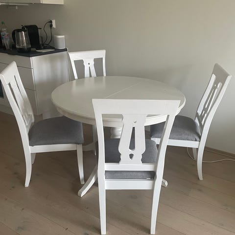 Fire spisestoler fra IKEA selges samlet. 150 kroner per stol, 600 kroner for alle fire. Pent brukt, med noen få bruksmerker. Selges samlet. Må hentes i Fyllingsdalen senest 30.12.