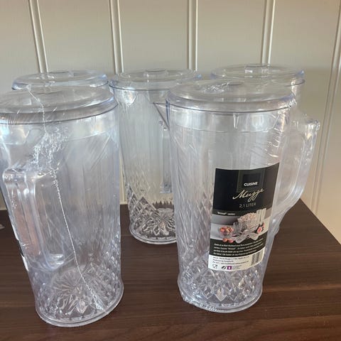 Selger to kjempesøte, små krukker/mugger i hvit keramikk med håndtak.