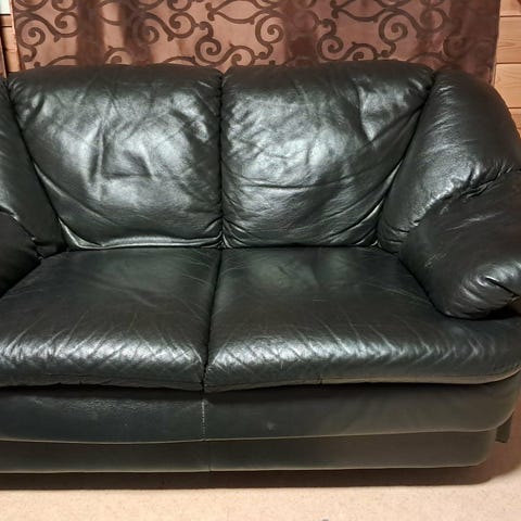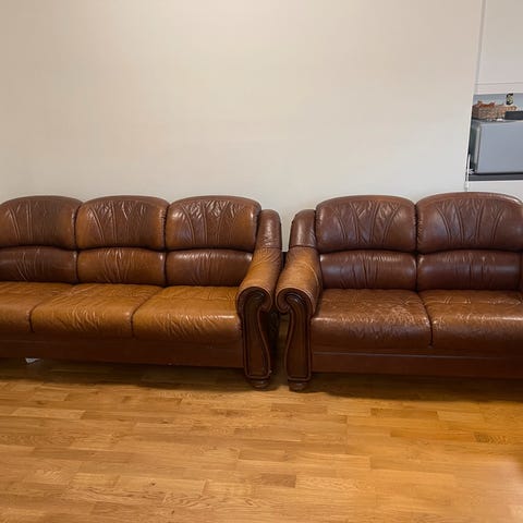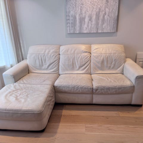 Natussi italiensk skinnsofa, stol og puff gies vekk