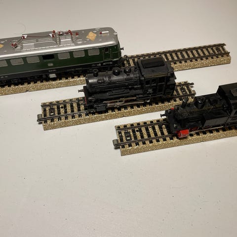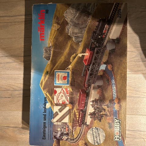 Eldre Märklin modelljernbane startsett som inkluderer skinner, lokomotiv, vogner og transformator. Settet inneholder buede og rette skinner for å sette opp en komplett bane. Transformatoren har en effekt på 10 VA og 220 V. Modelljernbanen passer for samlere og hobbyister. Strømmen fungerer og det blir lys i lokomotivet. Toget går ikke, men det er nok en smal sak å ordne for den som har litt peiling. Jeg har ikke gjort noe forsøk på å få det til å dra. Kom gjerne med bud. Kan selge deler hver for seg også.