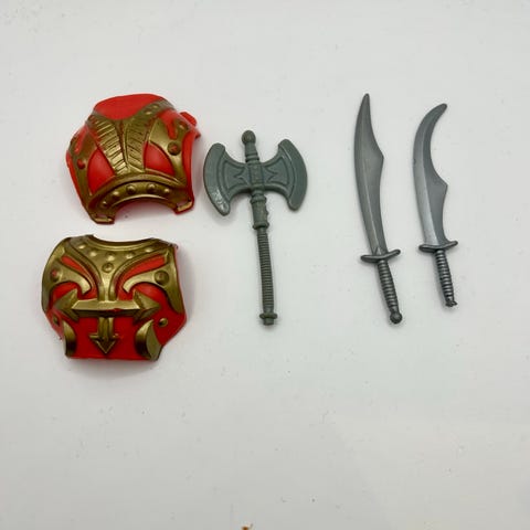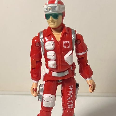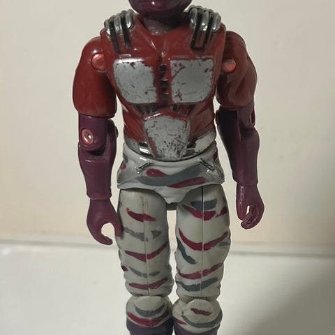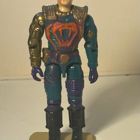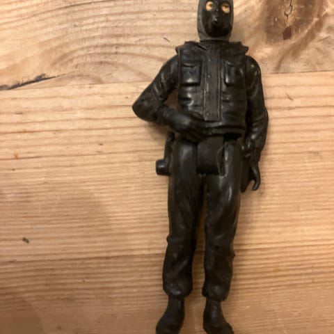 To A-Teamactionfigurer i blå og grønn drakt. Hannibal i blå og B.A. Barracus i grønn. Figurene er laget av Galoob fra 80-tallet og er på str med GI Joe/Action Force. Er litt lealøse i armene men de er over 35 år gamle. Ingen våpen inkludert. Egnet for samlere eller lek. Bud ønskes