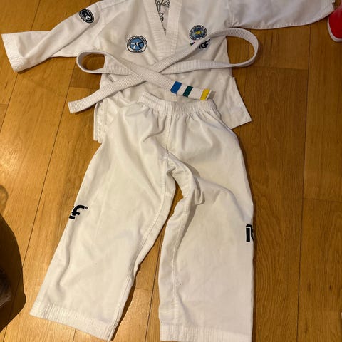 International Taekwon-Do Federation Taekwondo-drakt for barn i størrelse 130. Den har flere broderte merker som viser tilknytning til International Taekwon-Do Federation og National Taekwondo Norway.
