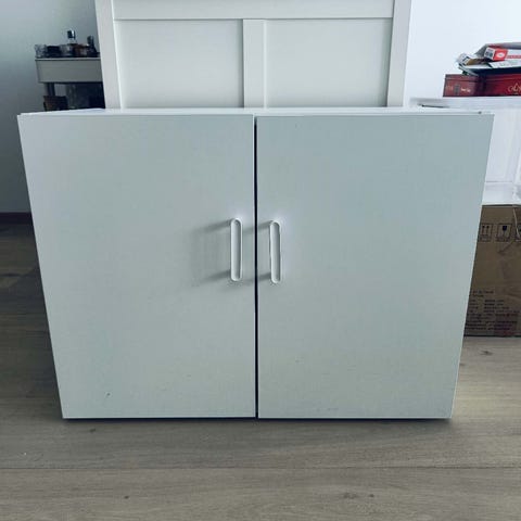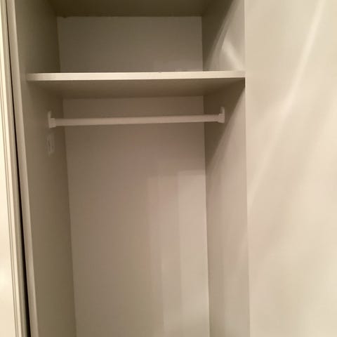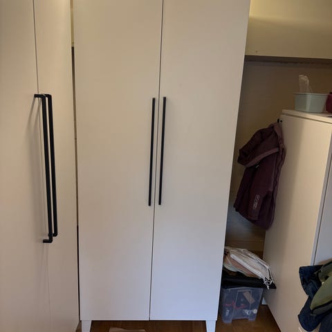 To platsa skap som er koblet sammen. Dører, skuffer og oppheng