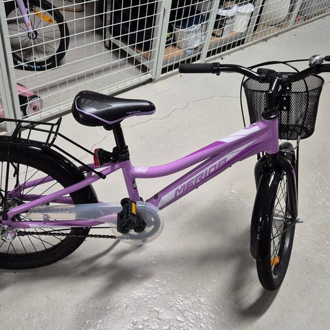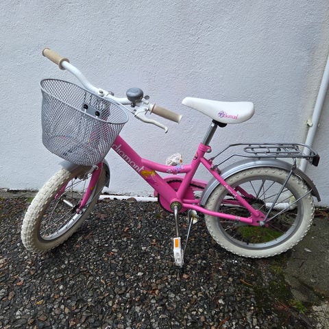 Jente sykkel med 16 tommer hjul i rosa og hvit farge. Sykkelen har kurv foran og bagasjebrett bak. Egnet for barn.