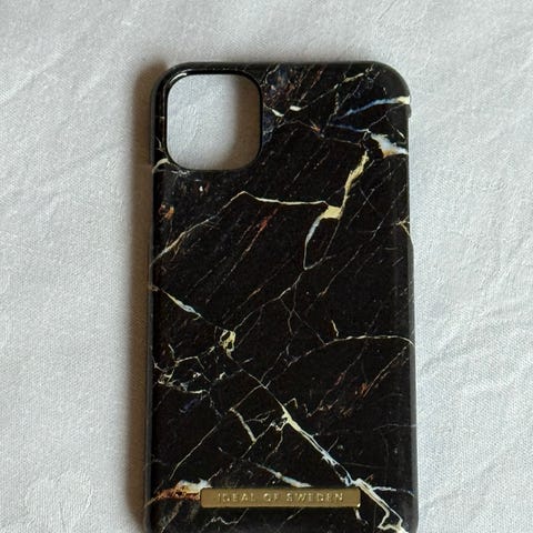 IDEAL OF SWEDEN telefondeksel med marmor design. Dekselet har en hvit base med brune og gullfargede marmormønstre. Passer iPhone 11 og muligens XR