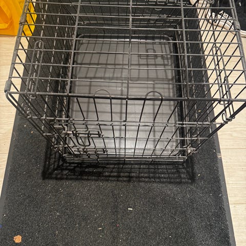 Sammenleggbart hundebur i svart metall selges. Burets konstruksjon er av metall med et avtagbart brett i bunnen for enkel rengjøring. Egnet for små- mellomstore kjæledyr.
