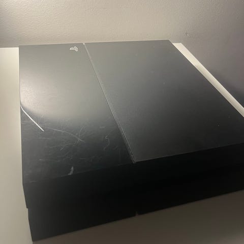 PlayStation 4 spillkonsoll i svart farge, inkludert en svart kontroller.