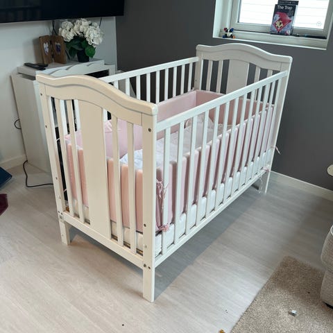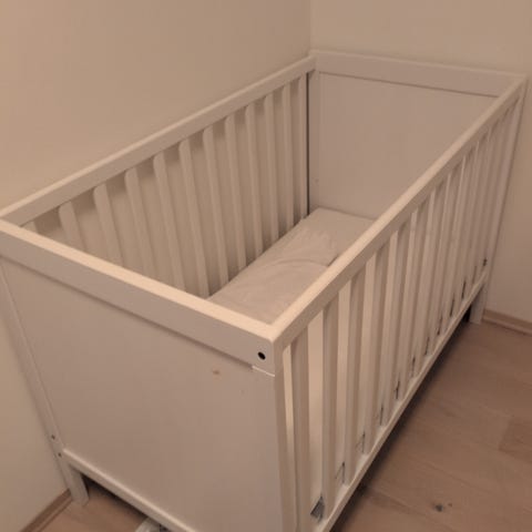 IKEA Sprinkelseng barneseng med hvit finish. Designet for barn, egnet som en trygg soveplass for småbarn. Laget av materialer som gir stabilitet og sikkerhet.