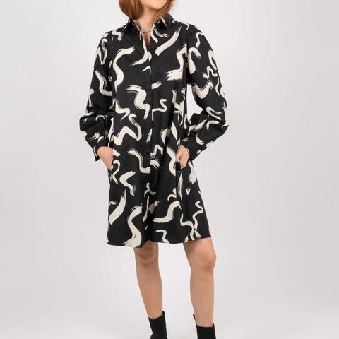 Lett og stilig kjole med lommer og ballongermer, glidelås bak og stilig mønster. Stoff som puster.