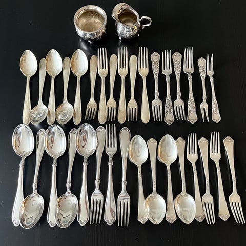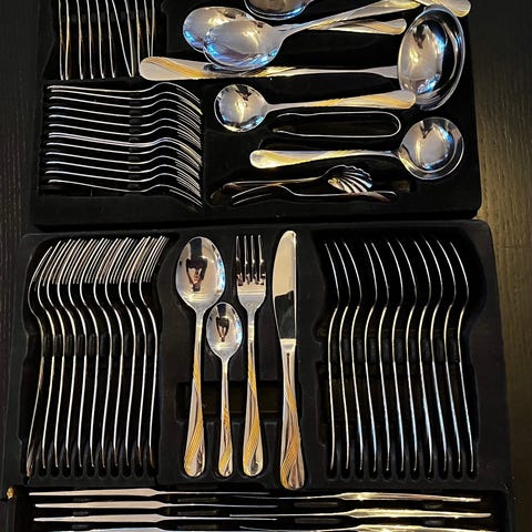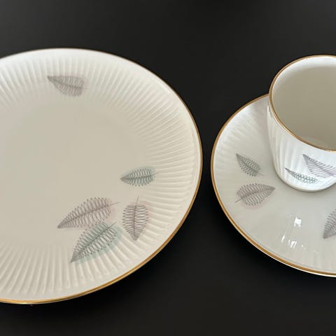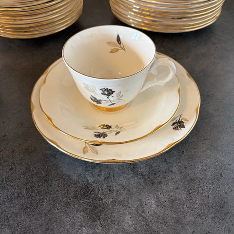 Settet består av 12 kaffekopper med tilhørende kaffeskåler i hvitt porselen med gulldekor. Serviset er stemplet «Mitterteich Bavaria – Made in Germany (U.S. Zone)» og er produsert i etterkrigstiden, ca. 1945–1949.
