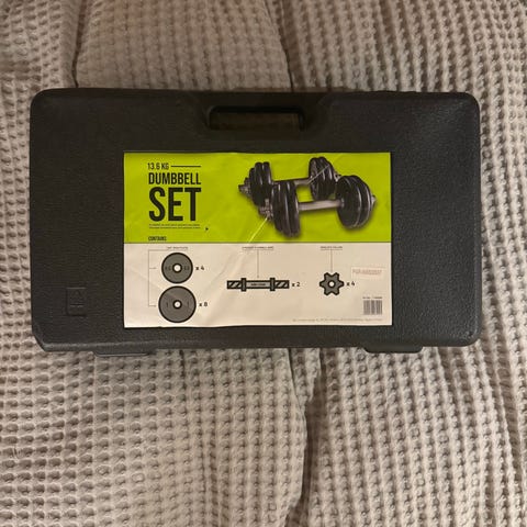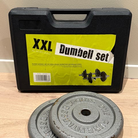 Ukjent dumbbellsett med totalt 4 vektskiver i ulik vekt. Settet inkluderer en håndvektstang med gjenger for festing av vektskiver. Materiale er metall. Passer for styrketrening.