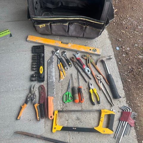 Skrustikke, vinkelsliper, kappsag og gjærsag, pussemaskin