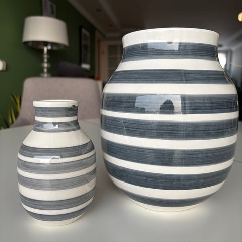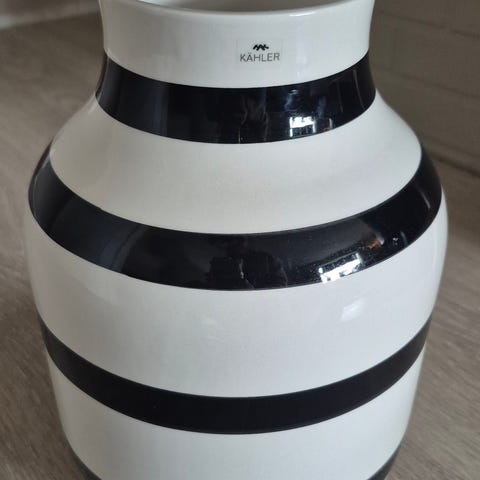 Kähler Omaggio Vase med horisontale striper i hvitt og olivengrønt.