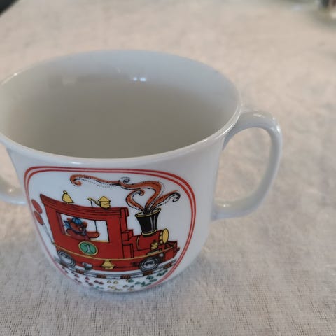 Barnekopp med to hanker og Peter Rabbit-motiv.