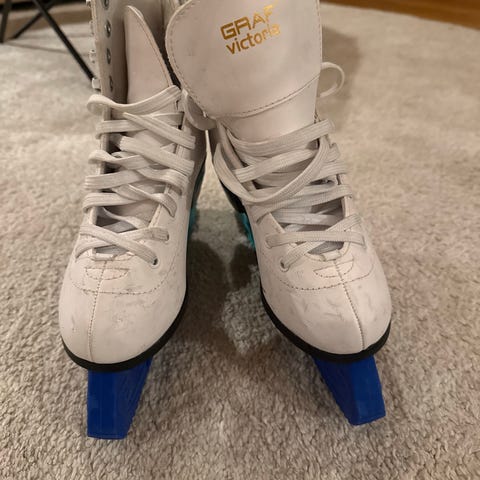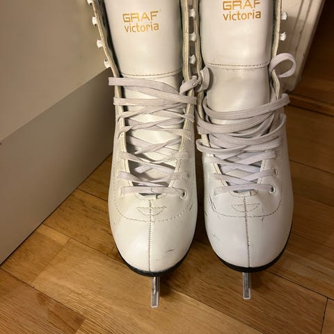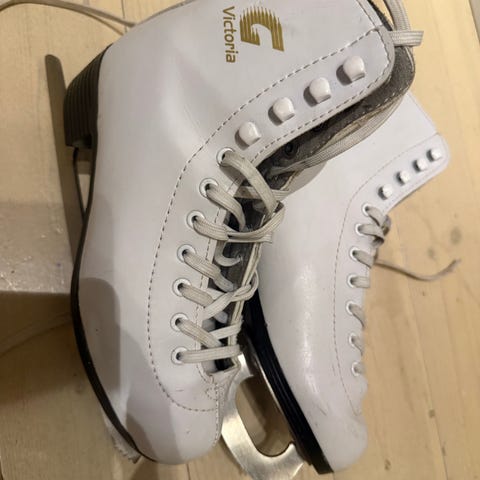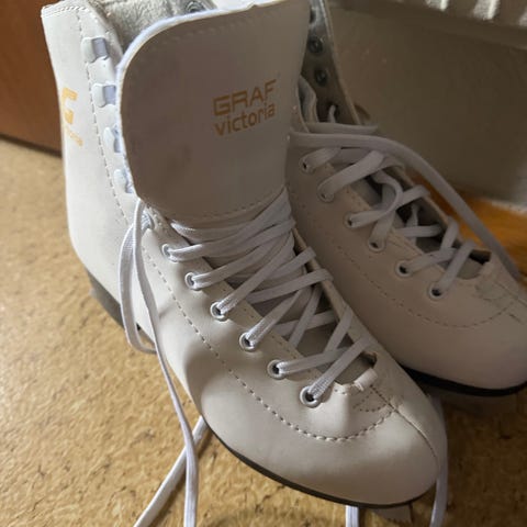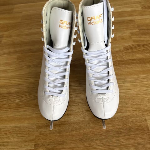 Klassiske hvite kunstløpsskøyter – godt egnet for barn eller nybegynnere i kunstløp.