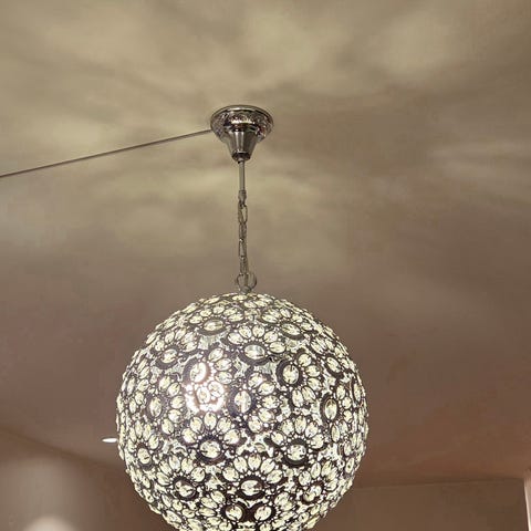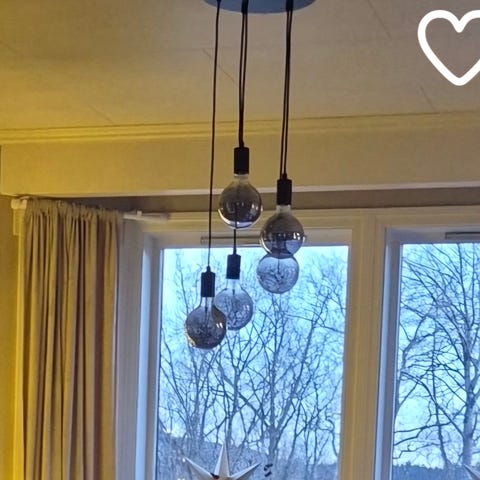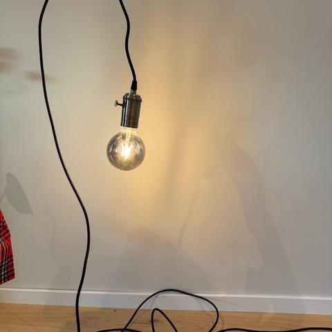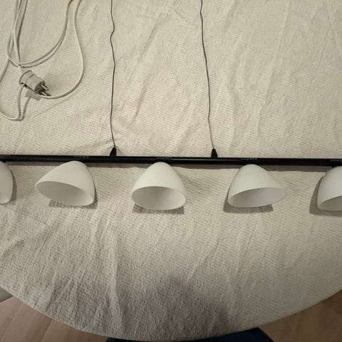 Rund taklampe i svart metall med detaljer i tre. brukt over spisebord, men etter vi flyttet har vi ikke funnet plass til den. kjøpt på jysk i 2021, må hentes.