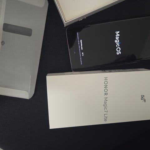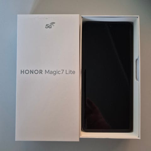 Honor Magic7 Lite mobiltelefon med 512 GB lagringskapasitet. Telefonen har et rundt kamerasystem på baksiden og en skjerm med liten frontkameraåpning. Designet i mørk farge med Honor-logo på baksiden. Kjøpt ny på Power 01.11.25. Såvidt litt brukt. Leveres i originalesken med nytt lommebokdeksel og nano flytende skjermbeskyttelse. Ny ladekabel.