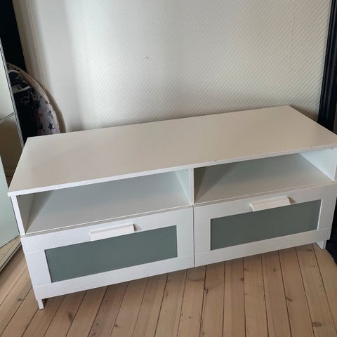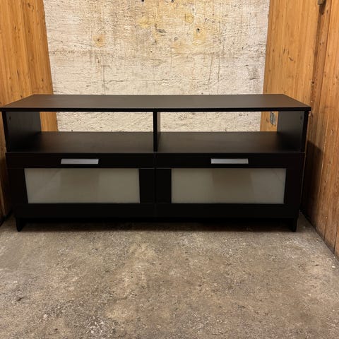 Svart TV benk med to skuffer fra Brimnes IKEA selges. Ny pris 1295kr, selges for 600kr. Pent brukt. Et lite synlig hakk oppå platen, se bilde. Ellers i pen stand. Må hentes.