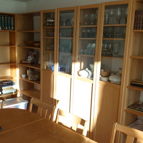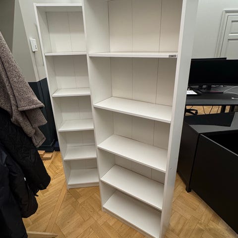 Hyllene består av fire deler. To hyller 28x40x106 + 2 påbygg 28×40×34. Jeg kan levere i Oslo Prisen på 200 inkluderer levering i (etter nyttår). Hentepris er 150.