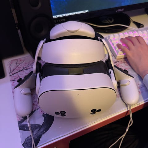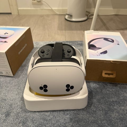Meta Quest 3 VR-headset i hvit farge. Inkluderer to kontrollere og lader med USB-C-tilkobling. Egnet for VR-spill og applikasjoner. Har bare blitt brukt ca 3 ganger og virker flott. Grunnen for at den blir solgt er at jeg ikke har tid. Kabelen har null merker og virker perfekt den også.