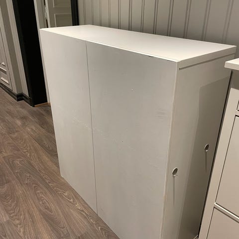 Den ser helt ubrukt ut. Ingen skader eller slitasje. Store fine glassdører på begge sider. Masse plass til pynt, glass, duker, porselen, bestikk/sølvtøy, bøker o.l.