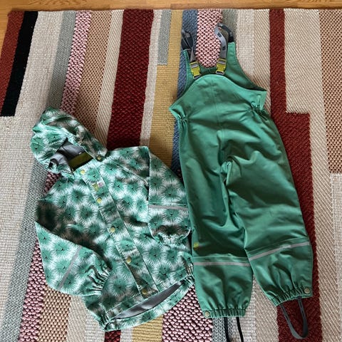 Pent brukt jakke og bukse weather Pro. Fin på høsten og våren. Waterproof til 10000mm. Super fint sett som er brukt til 1 barn. Har noen nupper og enkelte bruksmerker, men ingen hull. Mangler fotstrikker.