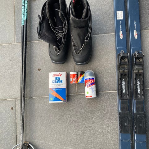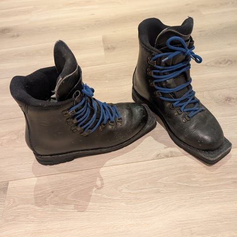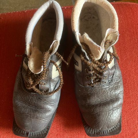 Dette er fjellskistøveler i str 38 som passer til de gamle klassiske, brede fjellski samt jaktski. Tre hull under, 75 mm.